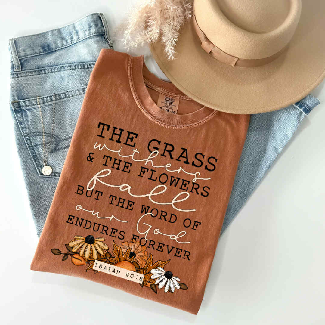Wrap yourself in the truth that never fades πΌπ This Fall Floral Comfort Colors Tee features a cozy rust hue and a beautifully hand-drawn bouquet surrounding the powerful scripture from Isaiah 40:8: