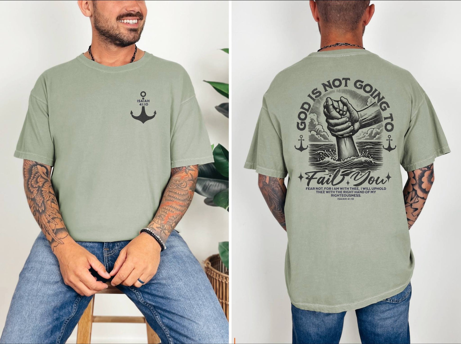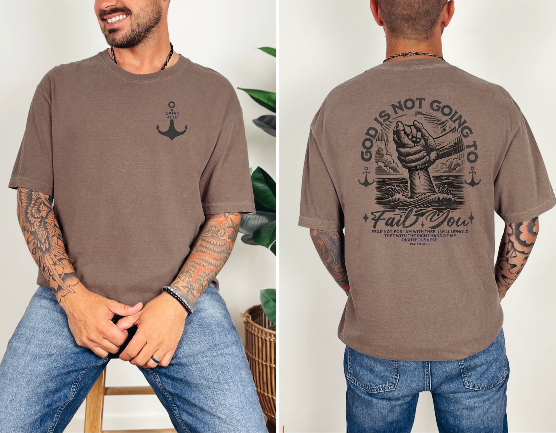 Bold faith. Unshakable promise. This powerful tee features a front anchor emblem paired with Isaiah 41:10—a reminder of God's steadfast presence. The back design makes a statement with two hands clasped in strength above crashing waves, surrounded by the words: